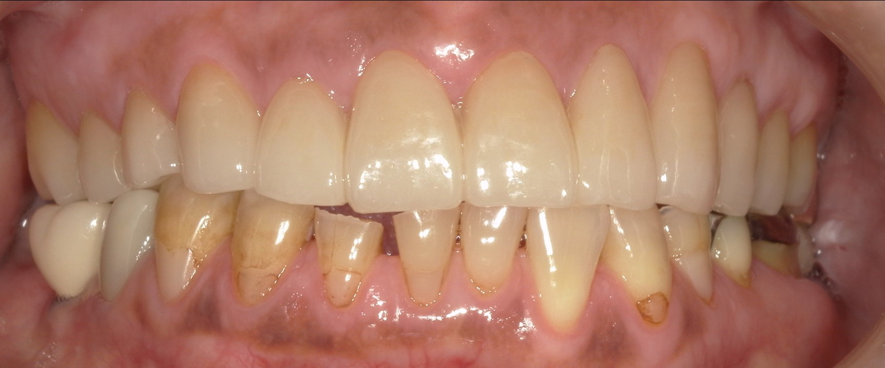 今回は費用の関係もあり下の前歯は治療せず、上の歯を中心に治すことで咬み合わせと見た目の改善を図った